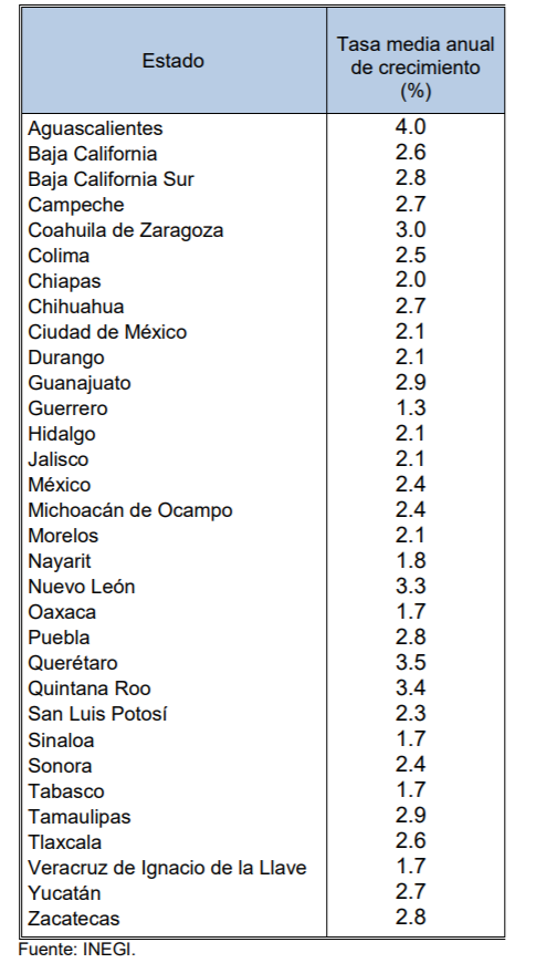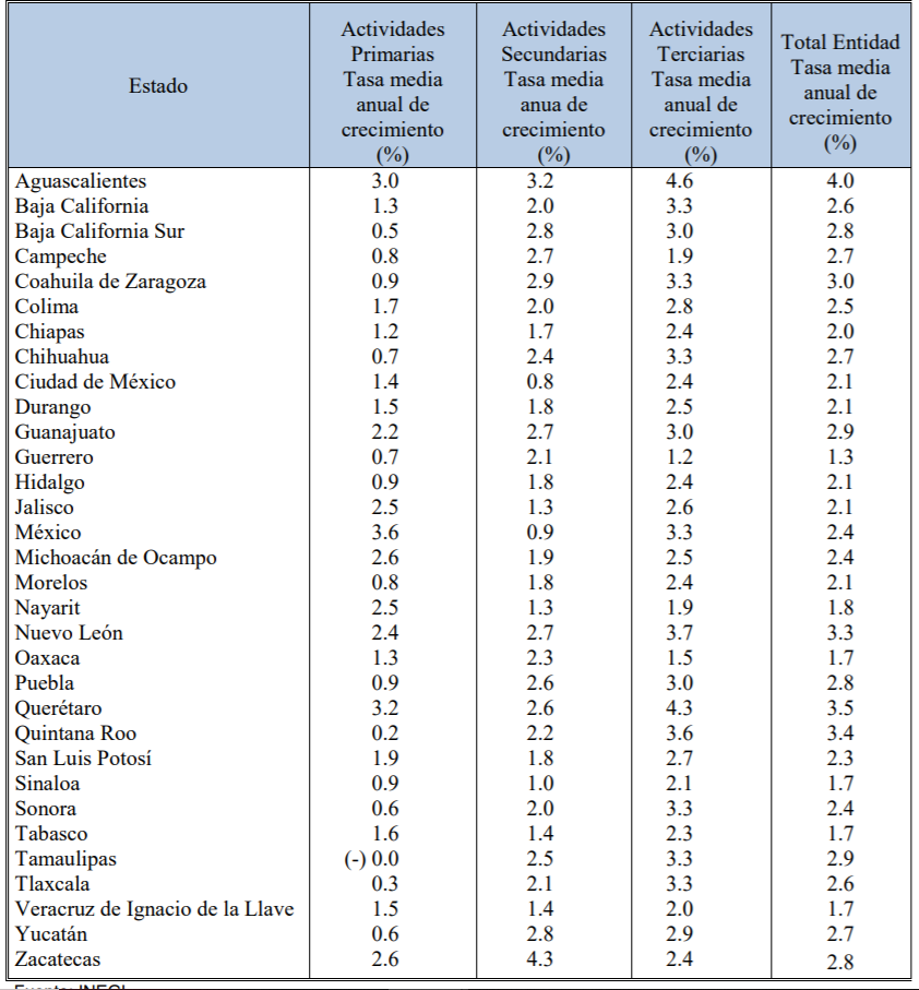 Entre 1980 y 2002, las entidades federativas que tuvieron una tasa media de crecimiento mayor fueron: Aguascalientes (4.0%), Querétaro (3.5%), Quintana Roo (3.4%), Nuevo León (3.3%) y Coahuila de Zaragoza (3%). En el mismo periodo, las entidades que registraron, en promedio, menores crecimientos fueron: Guerrero (1.3%), Tabasco (1.7%), Oaxaca (1.7%), Sinaloa (1.7%) y Veracruz de Ignacio de la Llave (1.7%).