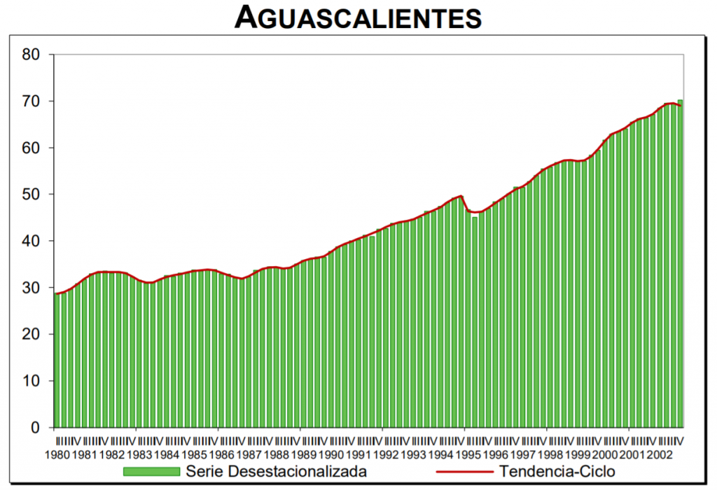 Mediante una estimación de modelos estadísticos y econométricos, el Instituto Nacional de Estadística y Geografía (Inegi) puso a disposición del público series retropoladas reducidas de algunos indicadores que integran el Sistema de Cuentas Nacionales de México (SCNM), la oferta de información contempla al Producto Interno Bruto (PIB) trimestral, anual y anual por entidad federativa, así como al Indicador Trimestral de la Actividad Económica Estatal (ITAEE) por actividad económica, de acuerdo con el Sistema de Clasificación Industrial de América del Norte 2013. En ellas, se puede dar seguimiento del comportamiento económico del país, las entidades federativas, por ejemplo que Aguascalientes se encuentra entre los estados que tuvieron una tasa media anual de crecimiento mayor entre 1980 y 2002, con un 4.0%