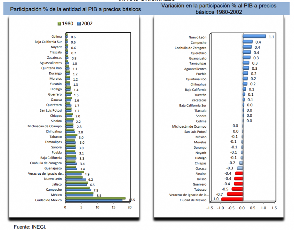 Durante 1980 al 2002, las entidades federativas que más aumentaron su contribución al PIB fueron: Nuevo León (1.1%), Campeche (0.4%), Coahuila de Zaragoza (0.4%), Querétaro (0.4%) y Guanajuato (0.3%). A su vez, las que más disminuyeron fueron: Ciudad de México (-1%), Veracruz Ignacio de la Llave (-0.7), Tabasco (-0.5%), Guerrero (-0.4%) y Jalisco (-0.4%).