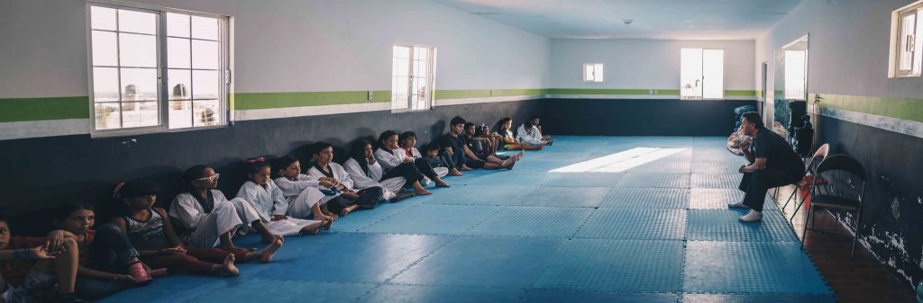 El gimnasio ubicado en un segundo piso es pequeño, mide unos 120 metros cuadrados y está cubierto casi en su totalidad por un tatami, dejando sólo un espacio pequeño para las madres que van a ver cómo practican sus hijos puedan esperar.