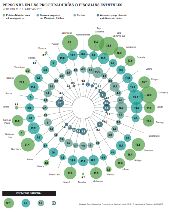 *Peritos: La entidad registra una tasa inferior de peritos al promedio nacional (4.8) con 4.7 por cada 100,000 habitantes.
