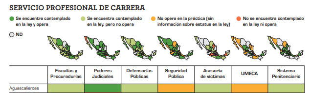 Como se observa, Aguascalientes tiene un déficit de personal para que se logre la correcta aplicación del sistema penal. Uno de los más alarmantes en el ámbito nacional, y en el que no figura con buen número el estado, es el de defensores públicos pues, Nayarit, que presenta la tasa más alta en éste rubro (5.9 por cada 100,000 habitantes), sigue mostrando un número bajo de defensores. “Esto deja en evidencia que no se han generado avances para revertir la insuficiencia de personal, lo que repercute negativamente en el acceso a la justicia”, se lee en el reporte Hallazgos 2018.