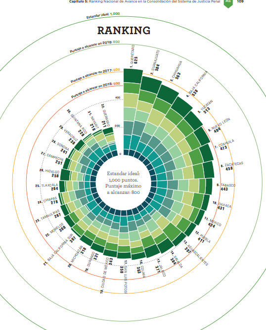 En Hallazgos 2018, Aguascalientes está posicionado en el décimo tercer lugar conforme al Ranking Nacional de Avance en la Consolidación del Sistema de Justicia Penal, obteniendo una puntuación de 397 de los 800 que eran la meta. La puntuación ideal estándar es de 1,000 puntos, siendo 800 el mínimo a alcanzar para considerarse como un buen desempeño. Ninguna de las 32 entidades logró obtener el mínimo; Querétaro se posicionó en el primer lugar con 625, aún lejano de la meta. En segundo lugar quedaría Guanajuato con 584 y en tercero Chihuahua con 563 puntos. El Ranking evalúa las condicionantes que tienen como objetivo diagnosticar desde un enfoque sistémico las políticas públicas en materia de justicia penal, así como analizar su integridad y el proceso de toma de decisiones.