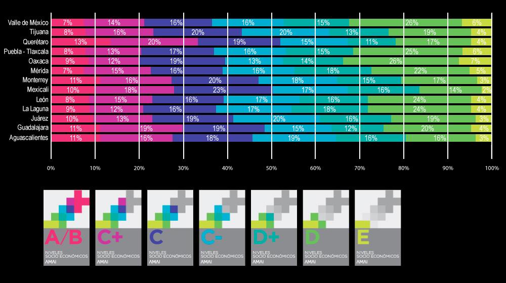 Entre las zonas metropolitanas Aguascalientes es la de menor cuantificación de los NSE “E” y “D” (19%) que son los de menor poder adquisitivo, solo por debajo de Mexicali que tiene 16%.