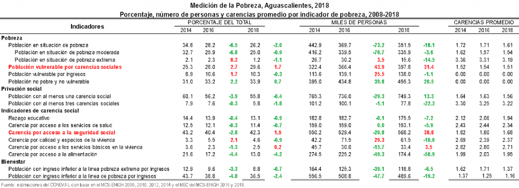 En Aguascalientes todas las carencias promedio vienen a la baja durante los dos últimos años, la materia pendiente se ubica entre las carencias por acceso a la seguridad social que alimenta la población vulnerable precisamente por carencias sociales; aunque aún esa, en carencias promedio, se encuentra a la baja.
