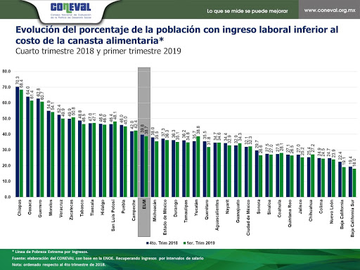 Para el Coneval, las tres entidades federativas que presentaron la mayor reducción en el porcentaje de población en situación de pobreza fueron Aguascalientes, Hidalgo y Tlaxcala.