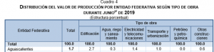 En cuanto a la distribución del valor de producción por entidad federativa según tipo de obra, para junio el estado concentró el 1.7% de éste. Por tipo de obra, Aguascalientes registra el 2.7% del total de obras de edificación en el país, el 0.3% de obras de agua, riego y saneamiento; el 1.4 para las de electricidad y telecomunicaciones; el 1.0 para las obras relacionadas con petróleo y petroquímica y el 0.6% de otras construcciones.