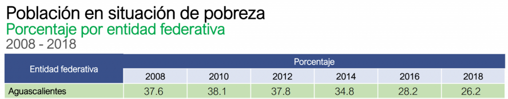 • El número de personas en situación de pobreza en Aguascalientes pasó de 369,652 (28.2%) a 351,529 (26.2%) entre 2016-2018. En el país, el número de personas en situación de pobreza pasó de 49.5 a 52.4 millones de personas entre 2008 y 2018.