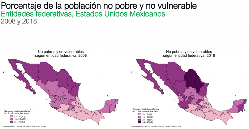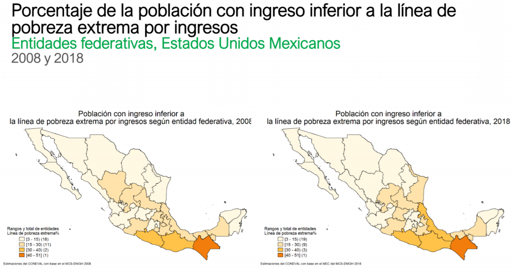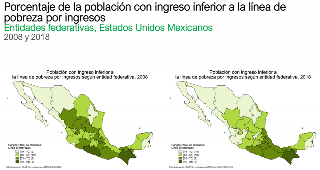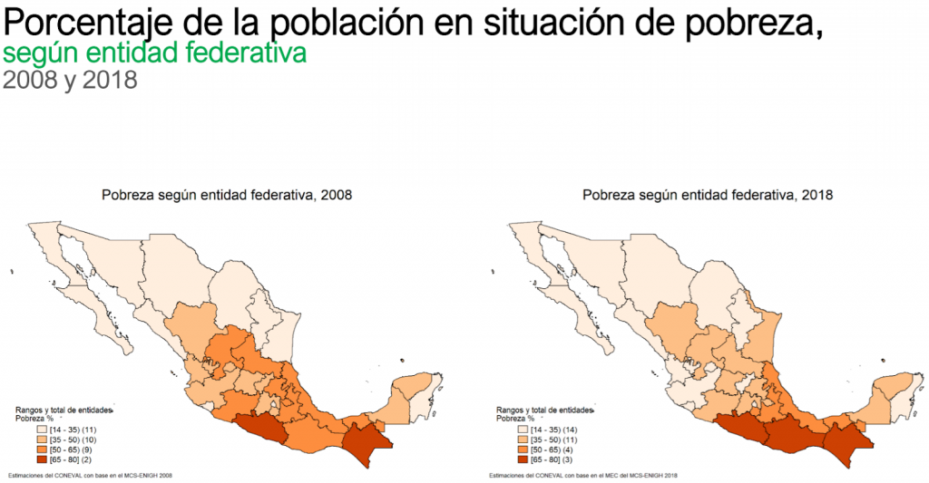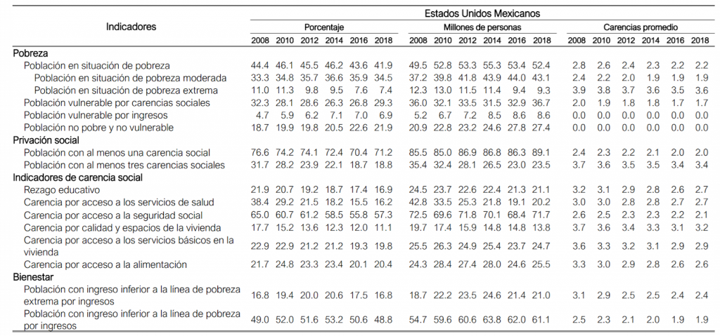 El Consejo Nacional de Evaluación de la Política de Desarrollo Social (Coneval), con base en la información proporcionada por el Instituto Nacional de Estadística y Geografía (Inegi), dio a conocer la información de diez años de medición multidimensional de la pobreza para completar la serie 2008-2018, lo que permite, por primera vez, observar la evolución de la pobreza de 2008-2018 en el país y para las 32 entidades federativas.