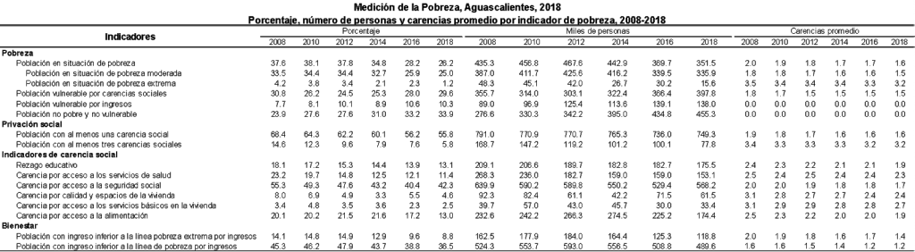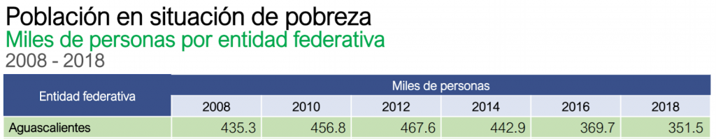 El número de personas en situación de pobreza en Aguascalientes pasó de 369,652 (28.2%) a 351,529 (26.2%) entre 2016-2018. En el país, el número de personas en situación de pobreza pasó de 49.5 a 52.4 millones de personas entre 2008 y 2018.
