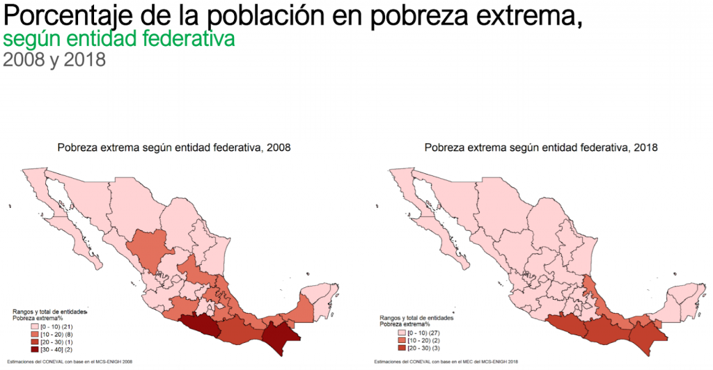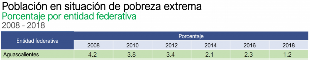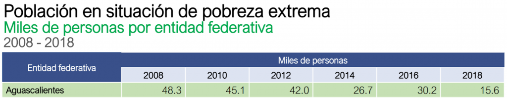 El porcentaje de personas en situación de pobreza extrema en Aguascalientes pasó de 2.3% a 1.2% en diez años; en el país este porcentaje pasó de 44.4% a 41.9% entre 2008 y 2018, una disminución anual media de 0.24 puntos porcentuales.