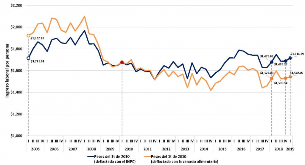 El ingreso laboral per cápita real en el primer trimestre de 2019 es mayor que el registrado en el primer trimestre de 2014, pero menor que en el mismo periodo de 2007.