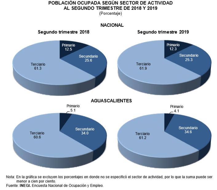 Entre el lapso abril-junio de 2018 y el mismo periodo de 2019, en los porcentajes de la población ocupada por sector de actividad, se observa un incremento en la participación de la ocupación en el sector secundario y terciario al pasar de 34 a 34.6% y de 60.6 a 61.2%, respectivamente, mientras que en el sector primario disminuyó un punto porcentual, en el lapso antes mencionado. En el ámbito nacional, puede observarse que el sector terciario aumentó su participación porcentual al pasar de 61.3 a 61.9 por ciento; mientras que, los sectores primario y secundario registraron un decremento de 0.2 y 0.3 de punto porcentual, respectivamente con relación al mismo periodo de 2018.