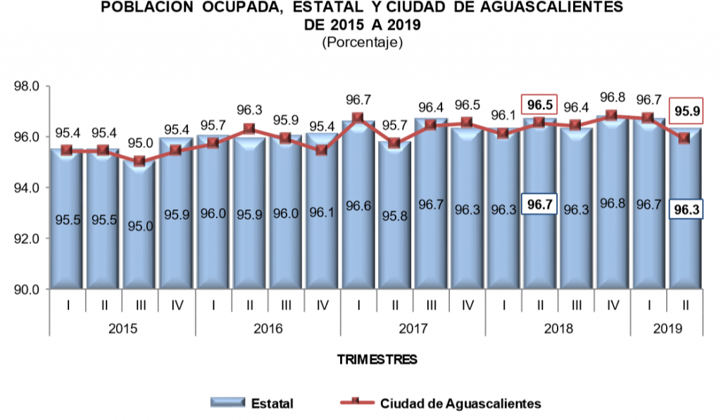 La población ocupada presenta un descenso, tanto en el estado como en la capital de Aguascalientes. En la entidad, pasó de 96.7 en el primer trimestre a 96.3 en abril-junio; mientras que en la capital el descenso fue de 96.7 a 95.9 para los mismos periodos. Por sexo, en el estado la TD para los segundos trimestres 2018 y 2019 en los hombres fue de 3.6 y 3.9%, respectivamente; mientras que la de las mujeres pasó de 2.9 a 3.4%.