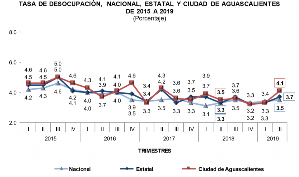 En el periodo de abril-junio de 2019, la población económicamente activa registró una tasa de desocupación (TD) de 3.7%, cifra mayor en 0.4 de punto porcentual con respecto a la del mismo periodo del año anterior (3.3 por ciento). Para la ciudad de Aguascalientes la TD es de 4.1%, mayor en 0.4 de punto porcentual con respecto a la presentada en la entidad.