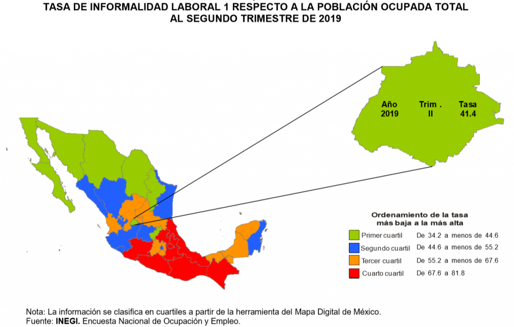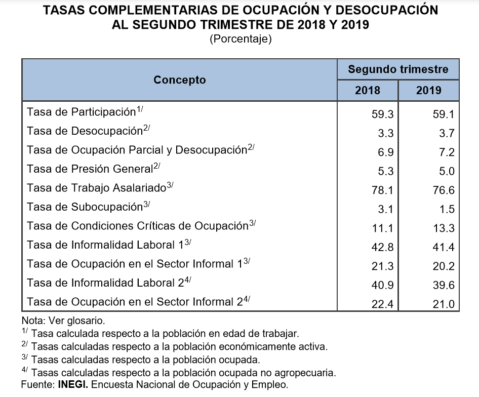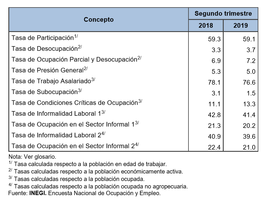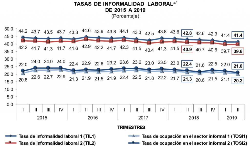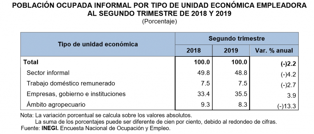 La población ocupada en un empleo informal (trabajo no protegido en la actividad agropecuaria, el servicio doméstico remunerado de los hogares, y trabajadores subordinados contratados bajo modalidades en las que se elude el registro ante la seguridad social), tuvo una variación negativa de (-) 2.2. en comparación con el mismo trimestre del año pasado, es decir, en abril-junio del 2018 el sector informal representaba el 49.8 y en 2019 el 48.8, aunque hay que mencionar que este porcentaje presenta un aumento en las unidades económicas formales (Empresas, gobierno e instituciones) al pasar del segundo trimestre de 2018 de 33.4 a 35.5 en abril-junio de este año, de lo que se deduce que un mayor número de estas unidades contrata a sus trabajadores sin brindarles seguridad social.