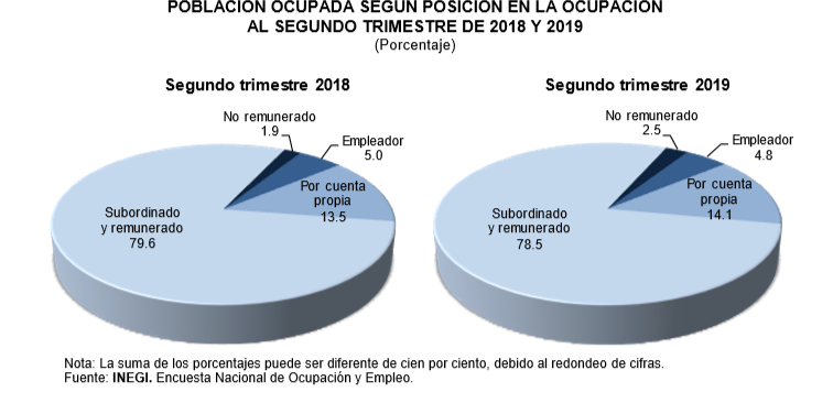 Entre los segundos trimestres de 2018 y 2019, los trabajadores por cuenta propia y los trabajadores no remunerados muestran un incremento en su participación de 0.6 de punto porcentual cada uno; mientras que, los trabajadores subordinados y los empleadores disminuyeron su participación en 1.1 y 0.2 puntos porcentuales