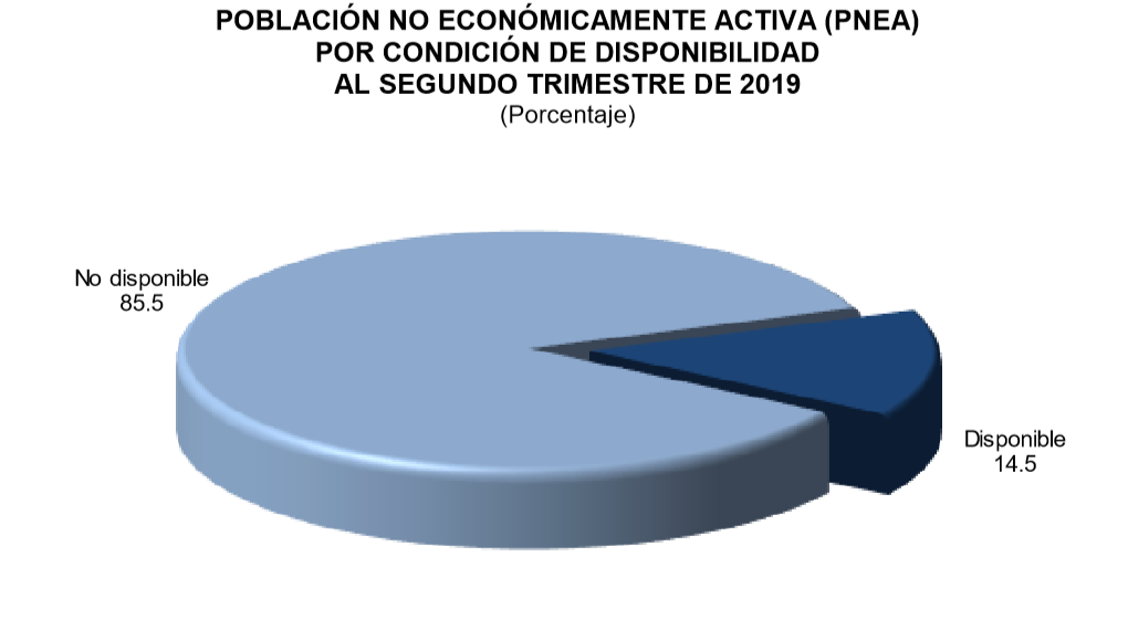 La población no económicamente activa (PNEA) agrupa a las personas que no participan en la actividad económica, ni como ocupados ni como desocupados. Durante el segundo trimestre de 2019, en la entidad, 85.5% de la PNEA no estaba disponible para trabajar, es decir, la perspectiva laboral queda totalmente fuera de su ámbito de interés por estar dedicada a estudiar, a las labores del hogar, jubilada, pensionada o incapacitada para trabajar; y 14.5% declaró tener alguna disposición para trabajar.