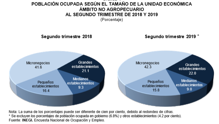 Otra característica de este grupo poblacional es el tamaño de la unidad económica en la que realizan sus actividades (si sólo se considera el ámbito no agropecuario que representa 77.5% de la población ocupada) al segundo trimestre de 2019, 42.3% estaba ocupada en micronegocios; 22% en grandes establecimientos; 15.8% en pequeños establecimientos y 9% en medianos establecimientos. Entre los segundos trimestres de 2018 y 2019, los porcentajes de la población ocupada en los grandes establecimientos y en los micronegocios se incrementaron en 0.9 y 0.7 de punto porcentual, respectivamente; por el contrario, los pequeños y medianos establecimientos disminuyeron su porcentaje de población ocupada en 0.6 y 0.3 puntos porcentuales en ese orden.
