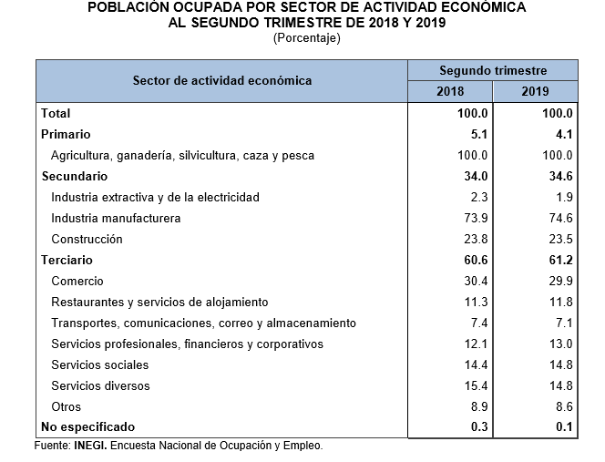 En el sector terciario o de servicios y comercio, la actividad que contribuye con la mayor participación laboral al interior de este sector económico es el comercio con 29.9%, seguido de los servicios sociales y servicios diversos con 14.8% cada uno. Entre los segundos trimestres de 2018 y 2019 los servicios profesionales, financieros y corporativos, los servicios de restaurantes y de alojamiento y los servicios sociales muestran un aumento de 0.9, 0.5 y 0.4 de punto porcentual respectivamente. Por otra parte, los servicios diversos, el comercio y los servicios de transportes, comunicaciones, correo y almacenamiento, registraron una disminución de 0.6, 0.5 y 0.3 en ese orden.
