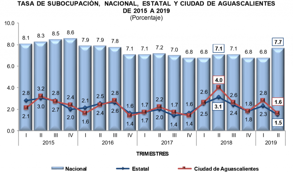 Durante abril-junio de 2019, en el estado y en la ciudad de Aguascalientes, la tasa de subocupación respecto de la población ocupada fue de 1.5 y 1.6%, en ese orden; inferiores en 1.6 y 2.4 puntos porcentuales respectivamente, en comparación con los porcentajes registrados durante el mismo periodo del año anterior (3.1 y 4%, respectivamente). En el ámbito nacional, este indicador es de 7.7% para el segundo trimestre de 2019, dato superior en 6.2 puntos porcentuales al registrado para la entidad y en 6.1 puntos porcentuales al de la ciudad de Aguascalientes.