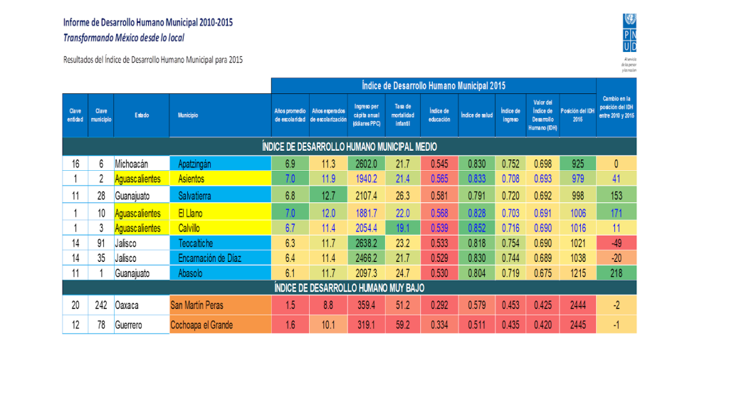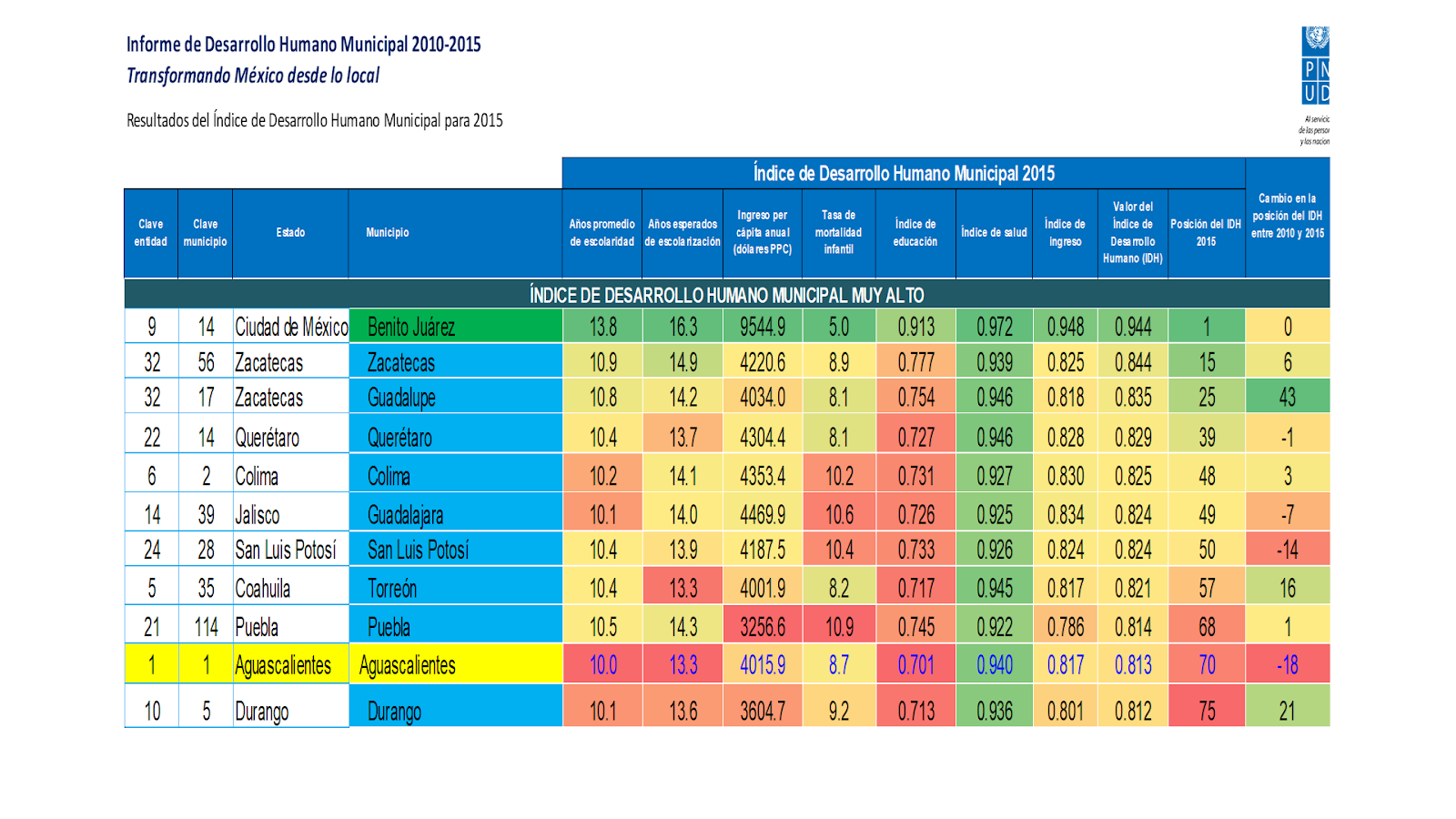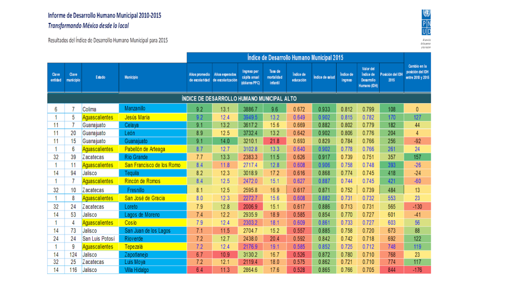 De hecho, las grandes desigualdades mexicanas se evidencian en la evolución de este índice. La mayoría de los municipios en los que el IDH disminuyó se encuentran en el sur del país, mientras que, en aquellos en donde se incrementó, se encuentran, en su mayoría, en las ciudades, es decir, prevalece la brecha entre el norte y el sur, pero también entre lo urbano y lo rural. En el caso de Aguascalientes capital tenemos un IDH de 0.813 catalogado como muy alto, es uno semejante al de Rusia, país ubicado en el lugar 49 en el ranking mundial y por otra a El Llano con 0.691 es un municipio muy cercano a El Salvador lugar 121 de la tabla.