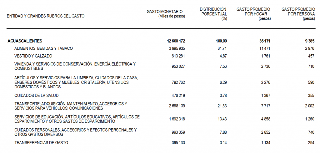 El mayor gasto corriente promedio trimestral por hogar correspondió a la Ciudad de México en contraste con la entidad federativa de Chiapas. Por rubros de gasto en lo que más gasta en promedio por hogar la Ciudad de México es en alimentos, bebidas y tabaco con 15,969 pesos trimestrales, a diferencia de cuidados de la salud en donde destina 885 pesos al trimestre, lo que representa un gasto promedio de 177 pesos y 10 pesos diarios, respectivamente. En Aguascalientes, en los grandes rubros de gastos, se destina el 31.71% del total a Alimentos, bebidas y tabaco, un promedio por hogar de 11,471 pesos y de 2,976 pesos por persona; en segundo lugar se ubica el gasto destinado al Transporte (21% del total) un promedio por hogar de 7,717 pesos y de 2,002 pesos por persona; el gasto dedicado a los servicios de educación ocupa el tercer sitio con un 13.43% del total, como se muestra en el siguiente cuadro: