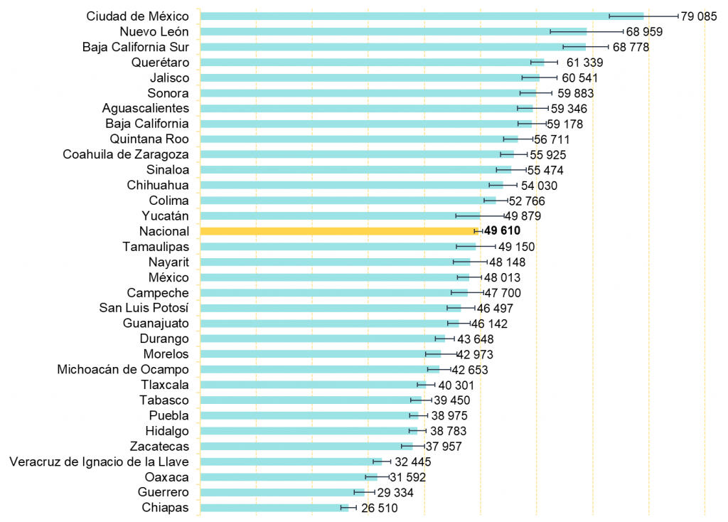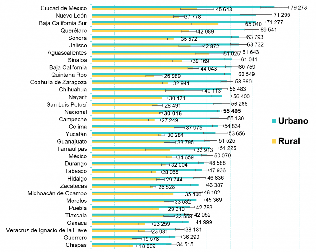 En las áreas urbanas, los dos mayores ingresos promedio trimestral por hogar se registraron también en Ciudad de México con 79,273 pesos y en Nuevo León con 71,295 pesos, en tanto que los dos menores ingresos promedio trimestrales por hogar correspondieron nuevamente a Guerrero y a Chiapas, con 36,290 pesos y 34,515 pesos, respectivamente. En Aguascalientes, el ingreso promedio trimestral por hogar fue de 61, 643 pesos, con lo que se ubica en el séptimo puesto entre todas las entidades federativas. Mientras que las áreas rurales de Baja California Sur y Aguascalientes presentaron los mayores ingresos promedio trimestral por hogar con 55,040 pesos y 51,025 pesos, respectivamente, mientras que los menores ingresos en áreas rurales correspondieron a Guerrero con 19,578 pesos y a Chiapas con 18,009 pesos.