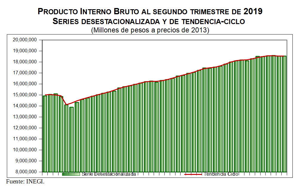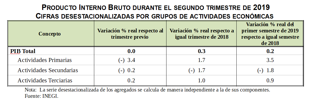 En su comparación anual, la economía mexicana reportó un incremento real de 0.3% en el segundo trimestre del año actual con relación al mismo lapso de 2018; mientras que por grandes grupos de actividades económicas, el PIB de las actividades primarias creció 1.7% y el de las terciarias 1%, mientras que el de las secundarias descendió 1.7% en igual periodo.