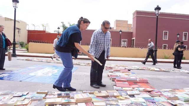 Este jueves en el Jardín de los Palacios se construyó una mega A con más de cinco mil libros que fueron recaudados por el municipio de Aguascalientes gracias a la buena voluntad y participación de los ciudadanos, instituciones educativas, ligas deportivas y asociaciones civiles. Este gran acervo de ejemplares de literatura clásica, aventuras, ciencia ficción, entre otros, irá a las Bibliotecas Municipales y a centros educativos de comunidades rurales y urbanas. A través del programa Un Libro por Aguascalientes el Ayuntamiento, se superó la meta estipulada logrando recolectar cerca de cinco mil ejemplares.