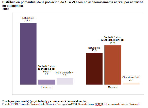 De los 30.7 millones de personas jóvenes en el país, 13.3 millones están considerados en la Población No Económicamente Activa (PNEA). Según la actividad que desarrollaron durante la semana de referencia, 52.7% son estudiantes, 37.9% se dedicaron a los quehaceres del hogar y 4.8% están en alguna otra situación. Al hacer la distinción de actividad según el sexo de la persona, se observa que, en los varones, 84.4% son estudiantes y 6.7% se dedicaron a los quehaceres del hogar. En el caso de las mujeres las proporciones son distintas: 43.3% son estudiantes y 54% se dedicaron a los quehaceres del hogar.