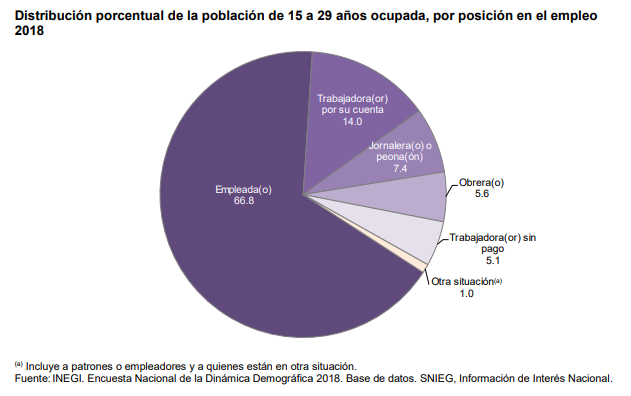 Según los datos de la Enadid 2018, 17.4 millones (56.5%) de los jóvenes son parte de la Población Económicamente Activa (PEA). De ellos 16.7 millones (96.3%) tenían algún empleo (población ocupada). De acuerdo con la posición en el trabajo 66.8% son empleados, 14.0% trabajan por su cuenta y 7.4% son jornaleros o peones. El complemento de la PEA, es decir 3.7% (673 mil) buscaron empleo (población desocupada) activamente durante la semana de referencia.