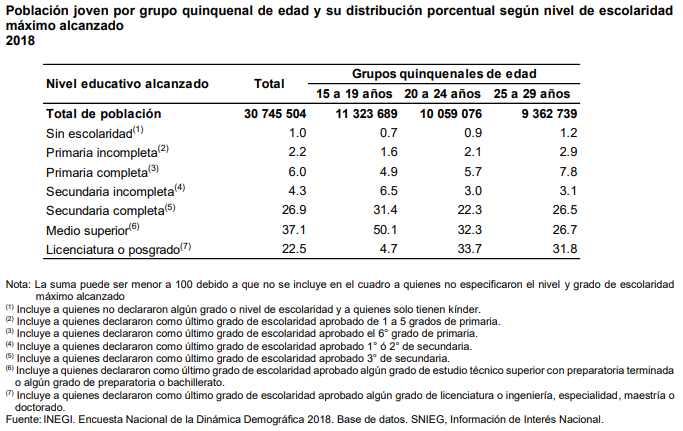 De acuerdo con información de la Encuesta Nacional de la Dinámica Demográfica (Enadid) 2018, en el país había 124.9 millones de personas. De ellas, 30.7 millones son personas cuya edad oscila entre los 15 y los 29 años; es decir, uno de cada cuatro habitantes del país es joven (24.6%), siendo un poco mayor la proporción de hombres (50.8%) que de mujeres (49.2%).