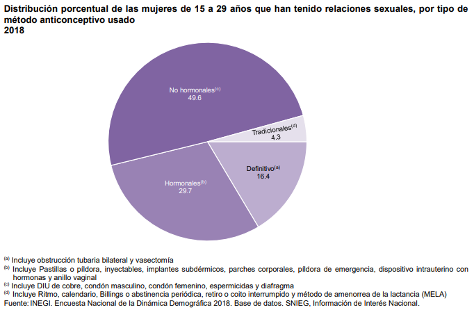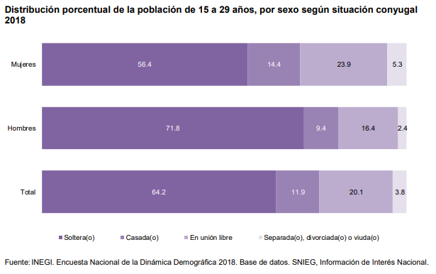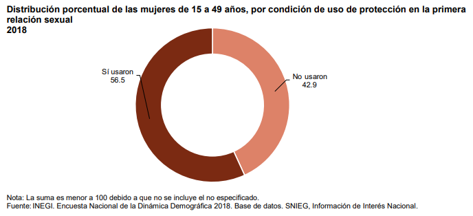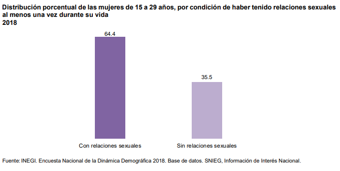En México, según la Enadid 2018, hay 15.1 millones de mujeres entre 15 y 29 años. De éstas, 6.7 millones (44.5%) han estado embarazadas al menos una vez y 8.4 millones (55.5%) no han estado embarazadas. La fecundidad en jóvenes de 15 a 19 es de 70.62 hijos nacidos vivos por cada mil mujeres. Dos de cada tres mujeres jóvenes han tenido relaciones sexuales al menos una vez en su vida (64.4 por ciento).