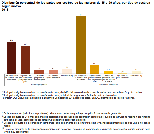 La Enadid 2018, en la sección de salud materno infantil, recolecta información sobre el embarazo más reciente. De esta información se obtiene que 5.5 millones de mujeres de 15 a 29 años estuvieron embarazadas al menos una vez entre enero de 2013 y septiembre de 2018. De estos embarazos, según la declaración de la mujer, 7.7% fueron interrumpidos por un aborto, 7 0.5% resultaron un mortinato, 8 90.7% concluyeron en un hijo sobreviviente y 1.2% fueron declarados como hijos fallecidos.