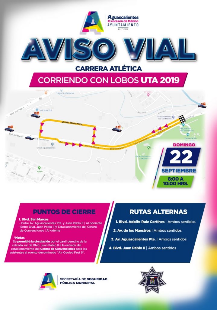 Con motivo de las carreras Club Campestre y “Corriendo con lobos” UTA 2019 se cerrarán vialidades este domingo de 8:00am a 10:00am y 9:00am a 11:00am