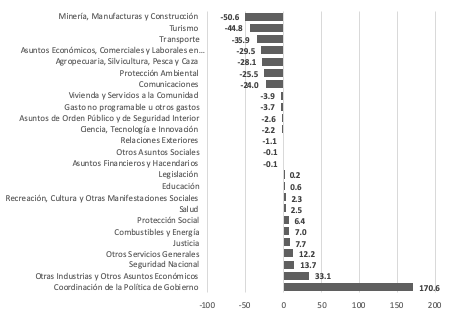 La desagregación mostrada por el gobierno, tal como lo muestra el siguiente gráfico, deja en evidencia que los grandes aumentos se observan en los asuntos relacionados con la coordinación política del gobierno, aquellos relacionados con otras industrias y otros asuntos económicos, así como en la seguridad nacional. Por el contrario, el castigo se observa en el sector minero, el turismo, el transporte, el sector agropecuario y el cuidado del medio ambiente.
