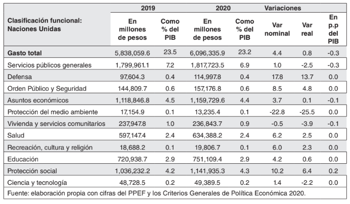 Al tomarse como referencia esta clasificación en 10 funciones de gobierno, se observa que para el 2020 el mayor aumento se registra en el rubro del gasto en defensa, que en términos reales registra un aumento cercano al 14%. Le sigue al gasto en protección social, el cual tiene una variación positiva superior al 6%, así como el gasto en orden público y seguridad, cuyo monto se incrementa en casi 5%, respecto al 2019. En contraste, destaca la notable reducción en el gasto en protección ambiental, la cual es cercana al 25%, al mismo tiempo que lo presupuestado para ciencia y tecnología, cifra que se reduce en un 2%, en términos reales. Educación apenas aumenta en un 0.6%, mientras que salud lo hace en un 2.5% respecto al año anterior.