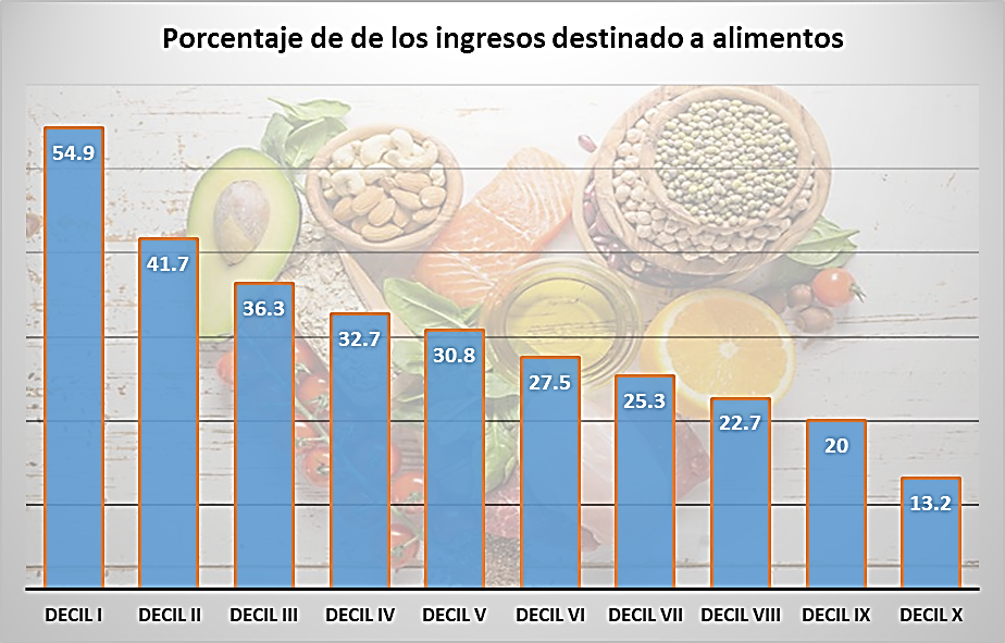 Conforme a datos de la ENIGH de Inegi mientras que a las personas del decil más pobre del país les cuesta uno de cada dos pesos de su ingreso poder alimentarse (la mitad de su ingreso), a la población del décimo decil o la de mayor ingreso, solo le cuesta uno de cada ocho pesos (13.2% de su ingreso).