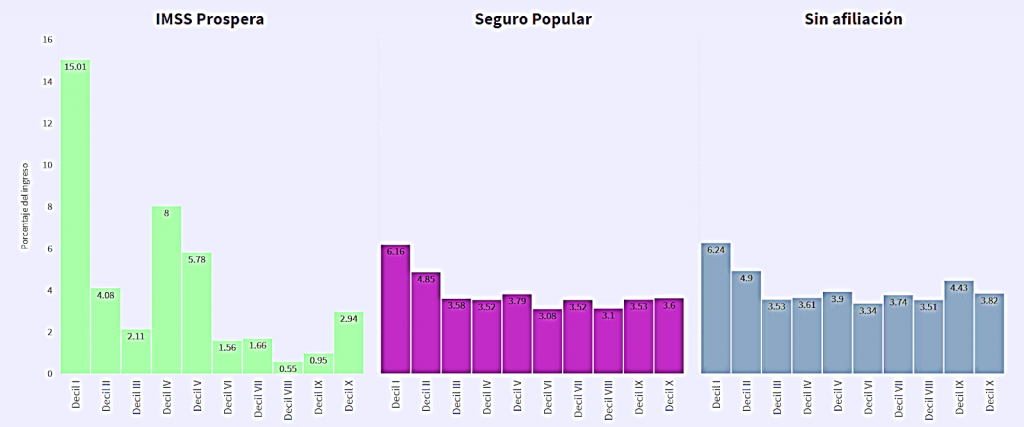 El área de investigaciones de Oxfam México, sostiene que existe evidencia de que “los hogares más pobres usan en mayor proporción Seguro Popular e IMSS Prospera al estar excluidos del mercado (formal)”, lo que favorece que “ante una ocurrencia extraordinaria, como un accidente o una enfermedad”, las precarias posesiones que tienen pueden verse muy afectadas.