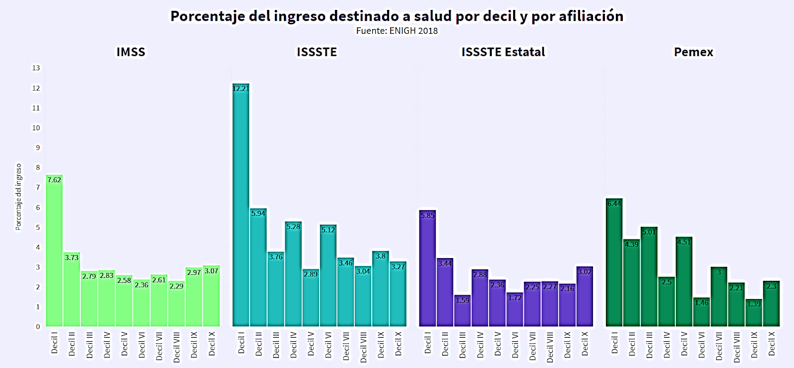 Mientras el decil con más ingresos destina en promedio 13.2% de sus ingresos para alimentarse, el decil más bajo gasta 55% de los suyos en comer. Tanto el CIDE como Oxfam-México, concuerdan en que: “a medida que los ingresos aumentan lo hacen también las estructuras de consumo”. Esto quiere decir que “cuando se sobrepasa cierto nivel de ingresos, se gasta un porcentaje menor en comida” lo que permite que se utilicen recursos para adquirir bienes “como vivienda, transporte o para el ahorro”.