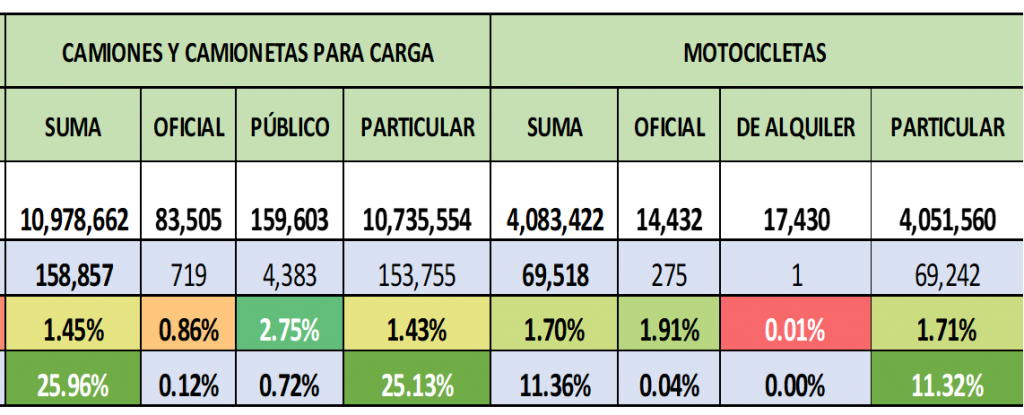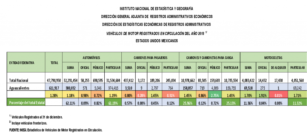 Lo más notable es que en Aguascalientes se cuenta con el 2.75% de los camiones y camionetas de carga, con 4 mil 383 de los 159 mil, en números relativos, es el valor más alto en el parque vehicular hidrocálido.