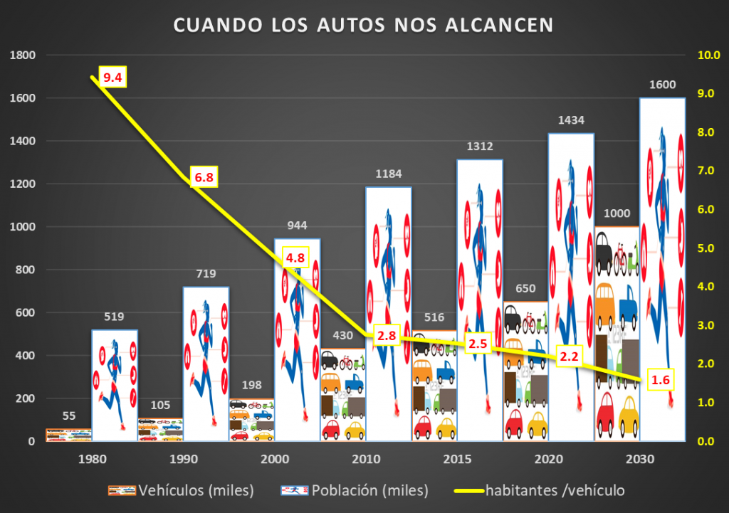 Hace un par de años escribí sobre este particular, esperando que el incremento del parque automotriz particular fuera menguando y el transporte público fuera creciendo. El uso del automóvil está produciendo daños en el medio ambiente y cada vez es más imperativo dejar este medio de transporte para probar nuevos medios de desplazamiento, como el transporte colectivo (que debe ser tan eficiente como para dejar el auto en la cochera) y desde luego las bicicletas y el saludable ejercicio de caminar. Se supone que, en una ciudad desarrollada a escala humana, todos los satisfactores necesarios deberían estar a máximo 20 minutos a pie desde cualquier punto donde se encuentre el residente. Pero las proyecciones actuales para la población y el parque vehicular afirman lo contrario.