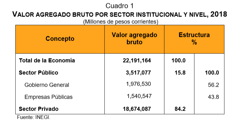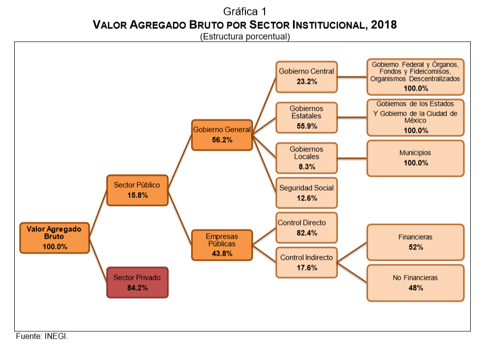El valor agregado bruto del Sector Público en 2018 se ubicó en 3,517,077 millones de pesos corrientes, monto que representó 15.8% del valor agregado bruto del total de la economía del país (véase gráfica siguiente).