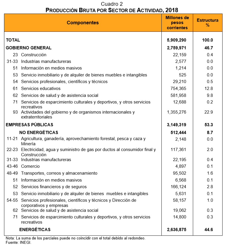 La producción bruta del Sector Público a precios básicos durante el 2018 sumó 5,909,290 millones de pesos corrientes, compuesta, en primera instancia, por la generada por las Empresas Públicas con el 53.3% del total. A su interior, el principal rubro fue el de las empresas dedicadas a la producción energética que contribuyeron con 44.6% de dicha participación y las empresas no energéticas que significaron el 8.7 por ciento.