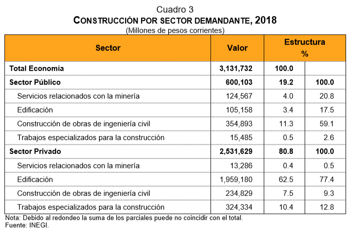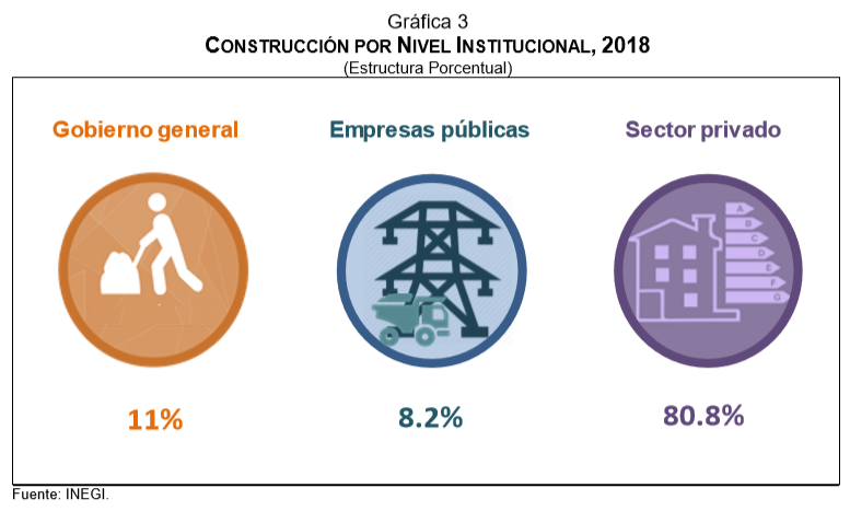 El valor de producción de la construcción del Sector Público (a precios básicos) fue de 600,103 millones de pesos corrientes en 2018, dato que representó el 19.2% del valor de la producción de la construcción total del país, en tanto que el del Sector Privado participó con el 80.8% restante.