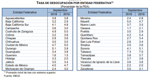 En cuanto a la tasa de desocupación por entidad federativa, en Aguascalientes se mantiene en 3.8% en septiembre del 2019, en relación con el mismo mes pero del 2018.