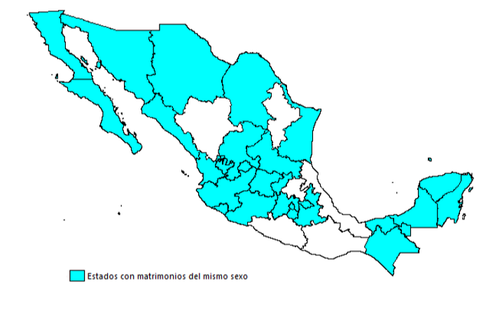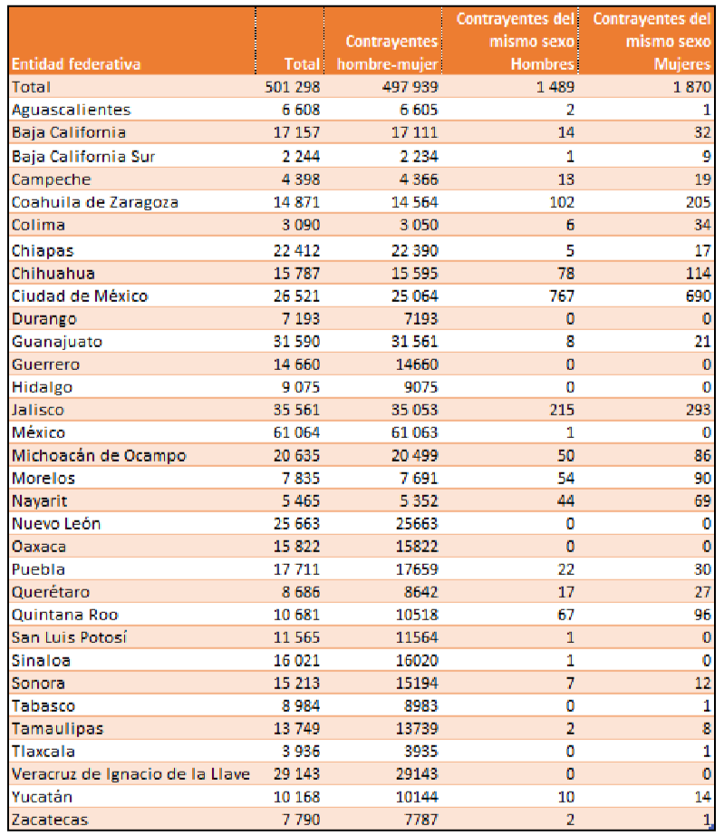 De las 32 entidades que conforman el país, en 26 estados se registraron matrimonios entre personas del mismo sexo, se observa un aumento de siete entidades respecto al año pasado, con un total de 3 359 matrimonios de los cuales 1 489 se realizaron entre hombres y 1 870 entre mujeres. Aguascalientes registró 6608 matrimonios, de estos, tres fueron entre personas del mismo sexo: dos entre hombres y uno entre mujeres.