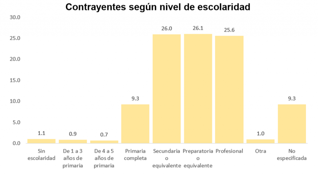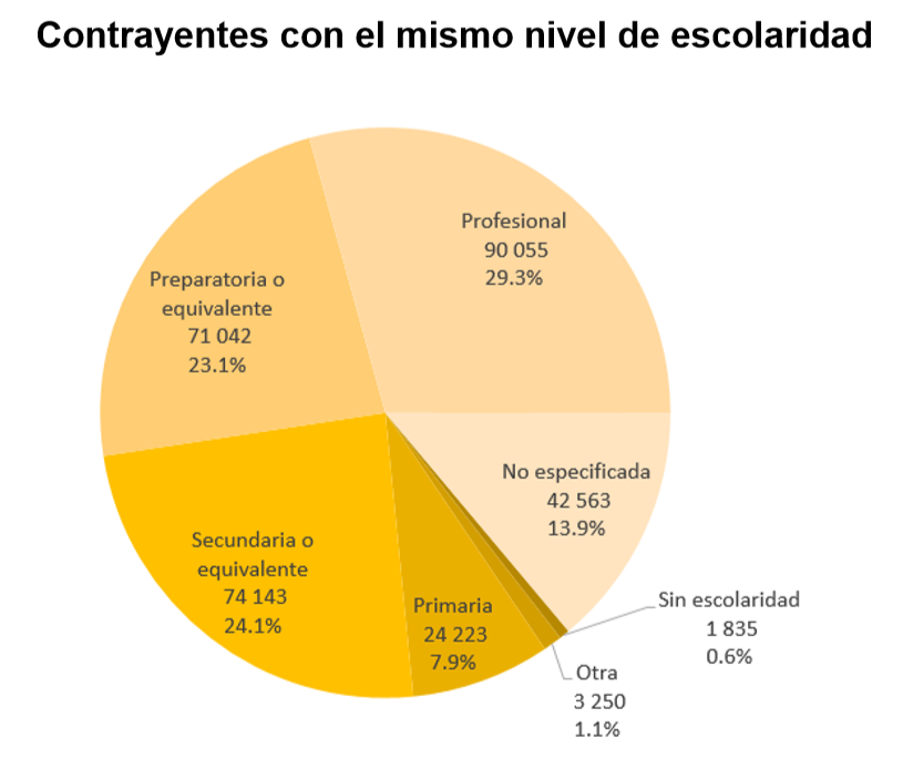 El 61.3% de los contrayentes se casan con personas del mismo nivel de escolaridad, existe un decremento respecto al año anterior de un 1%, destacando los profesionistas (29.3%), seguido de los de secundaria o equivalente (24.1%) y los de preparatoria o equivalente (23.1%).
