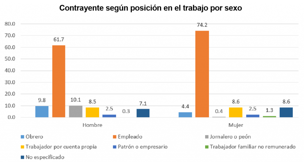 La principal posición en el trabajo de los contrayentes es la de empleado, con un total de 291 485 (61.7%) en hombres se observa un aumento del 1% y de 177 817 (74.2%) en mujeres, la cual presenta una disminución, respecto al año anterior en un 0.2%. En Aguascalientes, el 97.5% de los hombres trabaja, mientras que el 56% de la mujeres laboran.